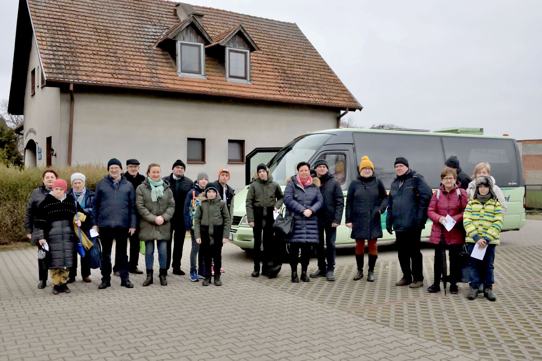 Uszestnicy Pielgrzymki do Sanktuarium Matki Bożej Uzdrowienia Chorych w Smolcach, na parkingu przed wyjazdem.